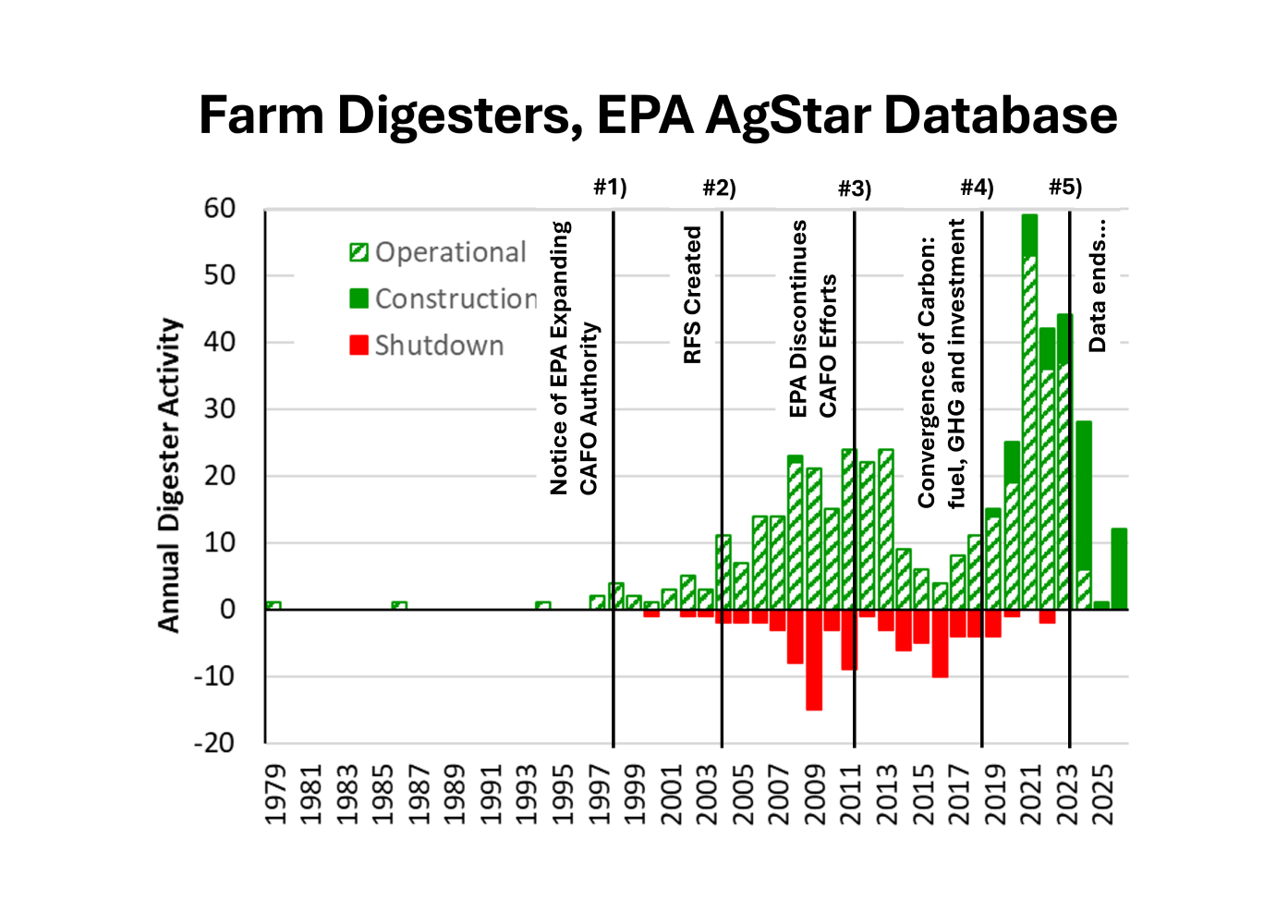 #5) This dataset was published in September of 2024 and likely was several month behind at that point. There were 11 farm digester projects under construction without a projected start date and there were also 11 farm digesters that had shut down without a reported date.