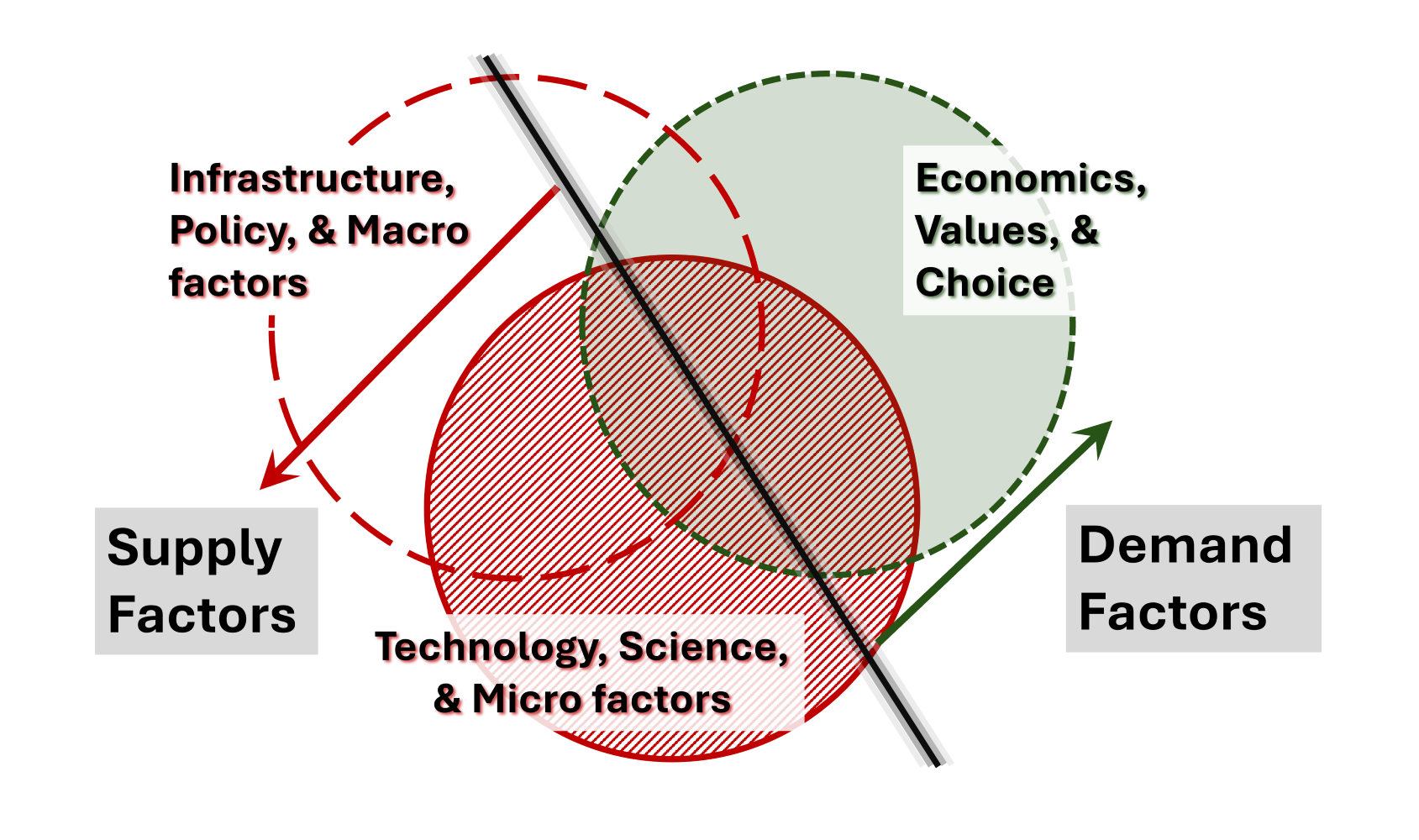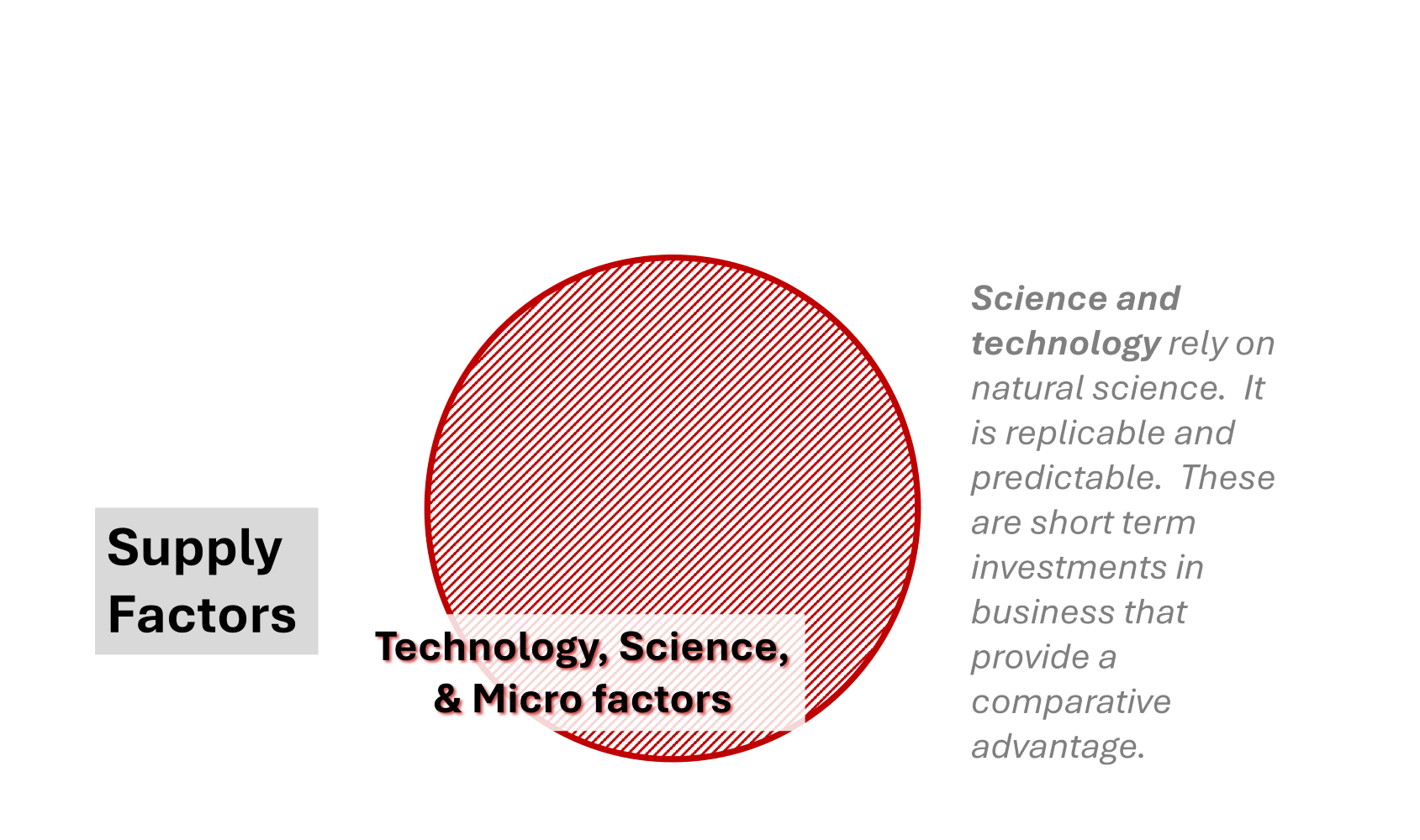 Differing Views from Short-term and Long-run Supply (circles within the Supply side). Even on the supply-side the applications of these terms can be broken down into microeconomic (short-term) and macroeconomic (long-term) definitions. Admittedly, this is not a very conventional definition of micro and macroeconomics. The short-term supply factors include the laws of science and technology. Most business decisions fall into this container.