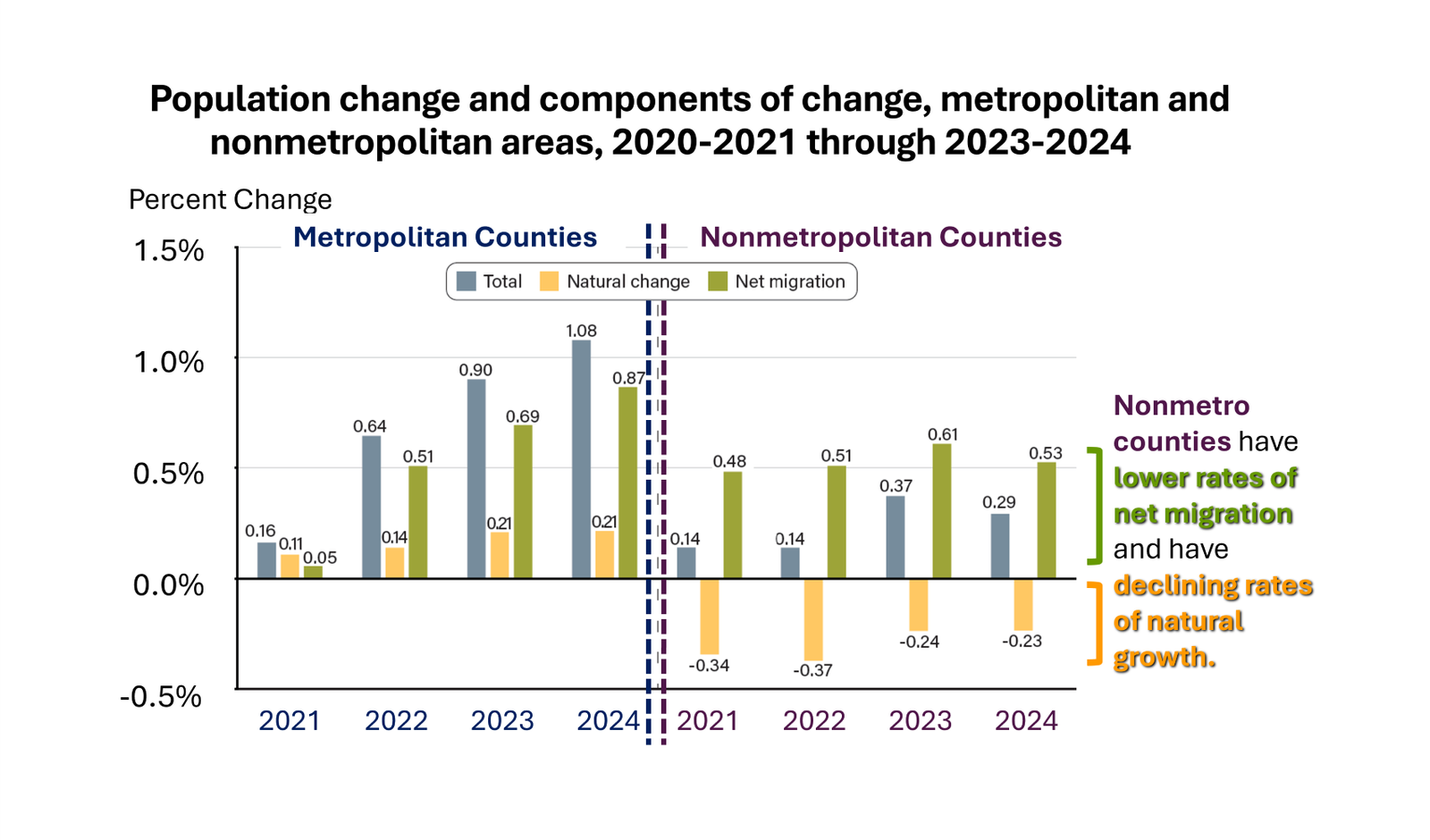 This chart from the recently released, Rural America at a Glance, illustrates that the natural growth cycle in nonmetropolitan counties are negative. The factor that allows populations to be positive, is that more individuals still migrate into nonmetropolitan counties. But individuals migrate into these rural areas at a lower rate than individuals migrate into the metropolitan counties. This post’s chart provides 4 years of population data.